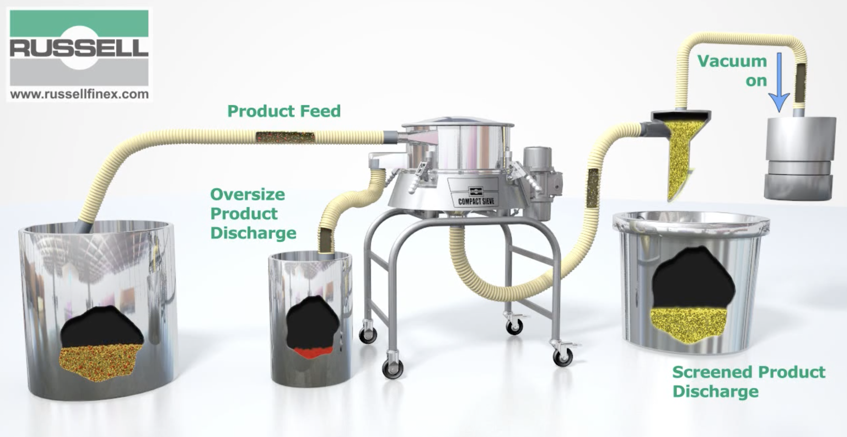 主に、粒状・粉状・角状原料の分別に使用されますが、調味料やソースといった液状の分別にも使用される場合があります。