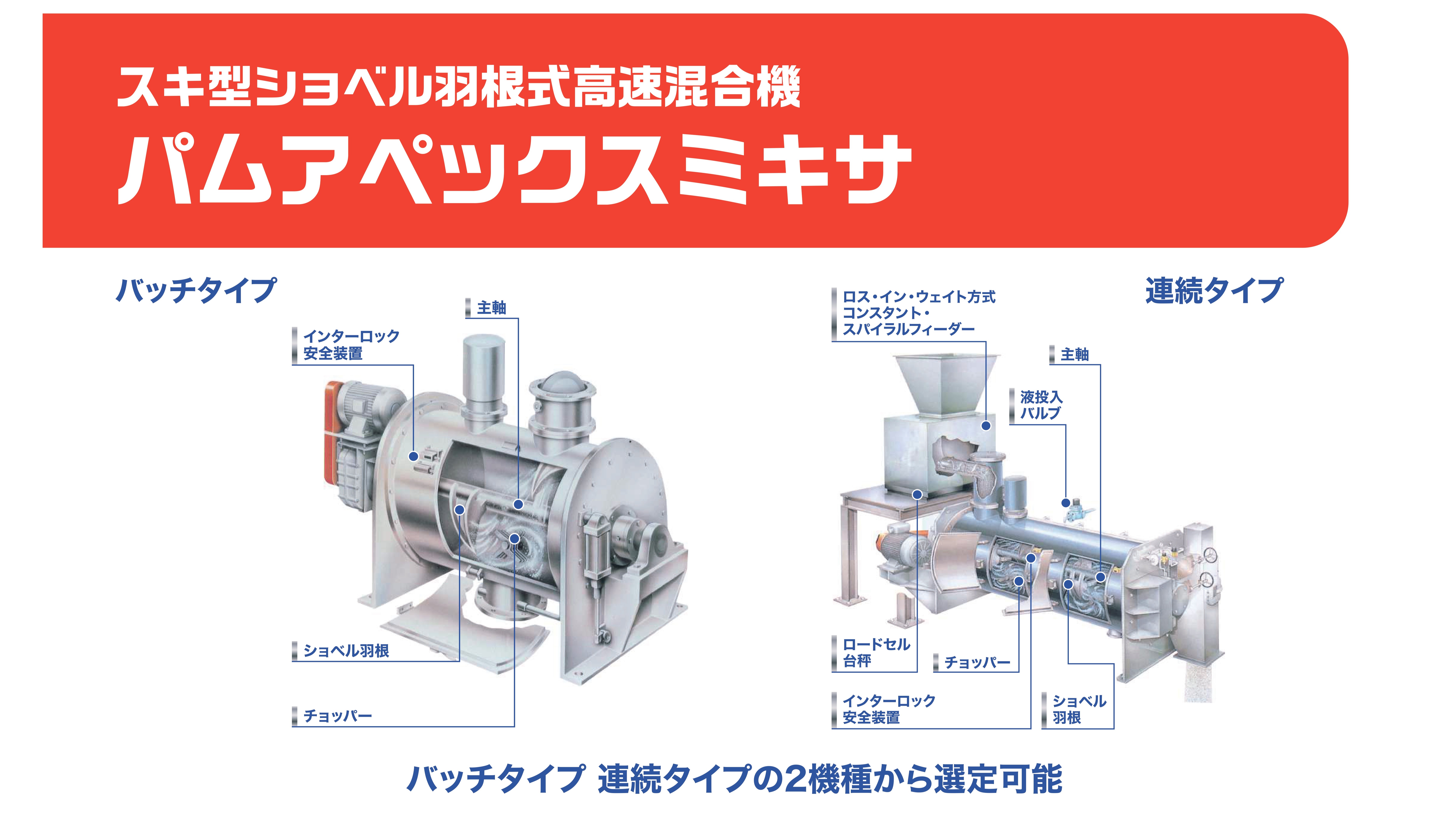 混合機(ミキサー)とは、2種類以上の原料を攪拌羽を用いてかき混ぜる、又は原料を投入した容器を回転させるなどして混ぜ合わせる装置のことをいいます。