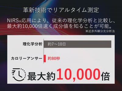 栄養成分測定装置「カロリーアンサー」は、近赤外線分光分析法を応用し、わずか80秒で高精度な栄養成分の測定を可能とする装置です。測定に専門的な知識は必要とせず、サンプルをセットし、ボタンを押すだけで栄養成分表示に利用可能な6項目を一括表示します。