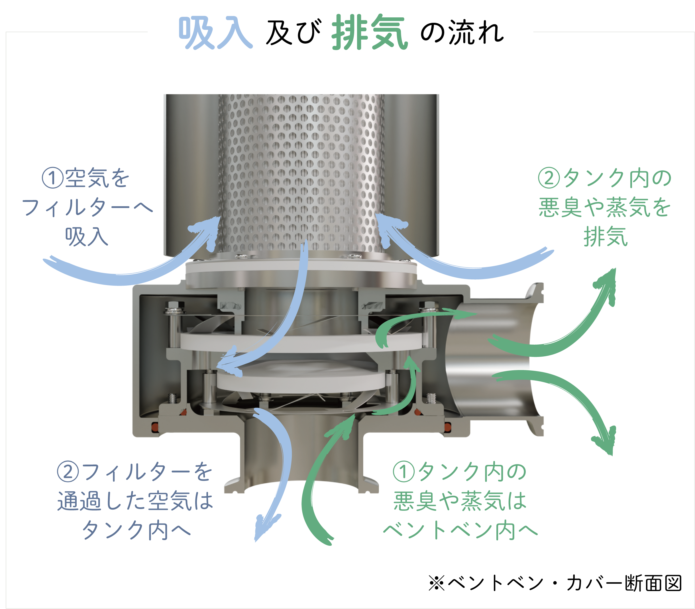 従来のタンク用ベントフィルターは、給気と排気のすべてをフィルター(濾過材)に通す構造でした。