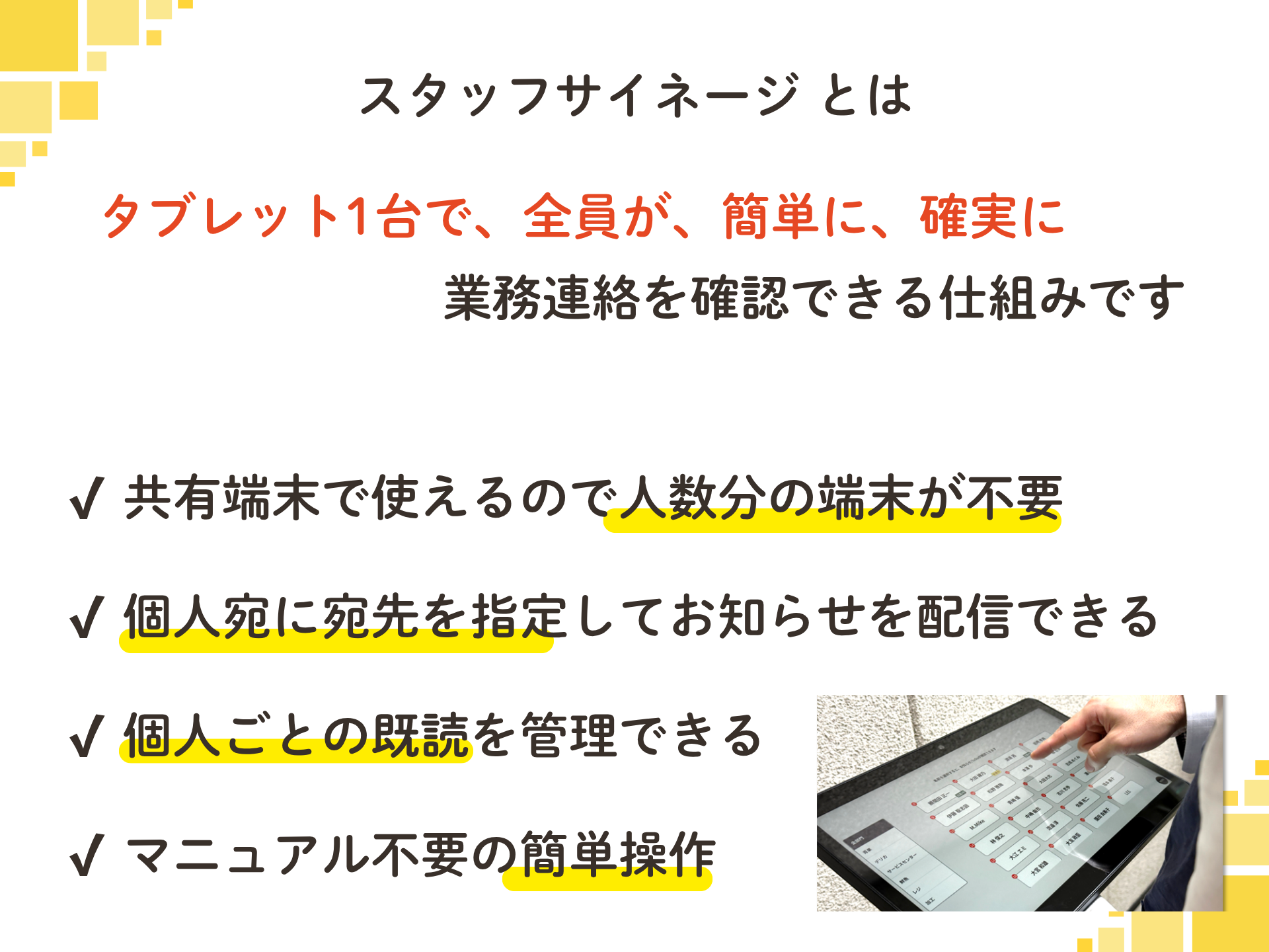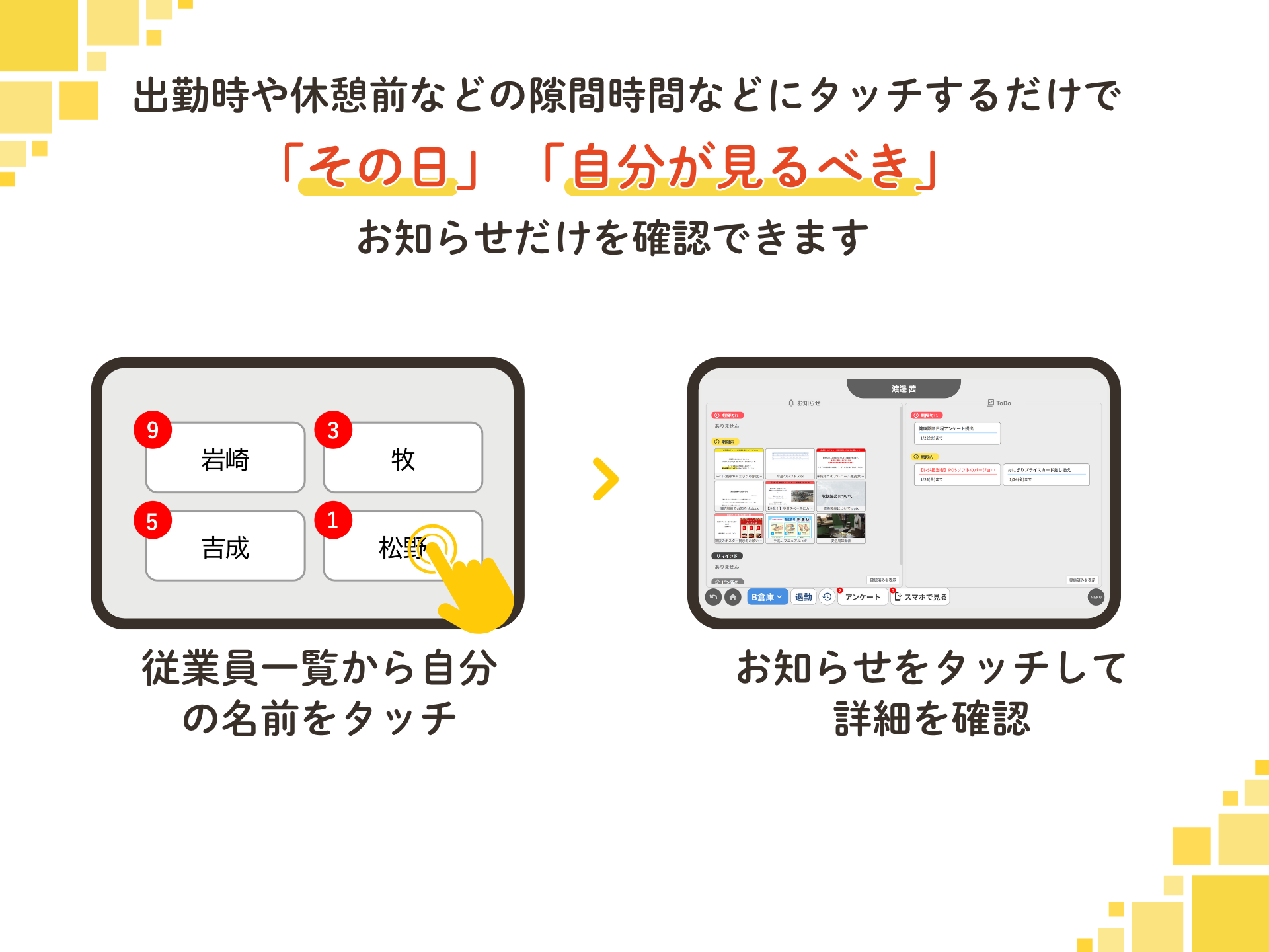 PCやスマホを持たないスタッフでも、タッチ操作だけで内容を確認でき、「誰が・いつ・どの情報を見たか」を自動で記録します。