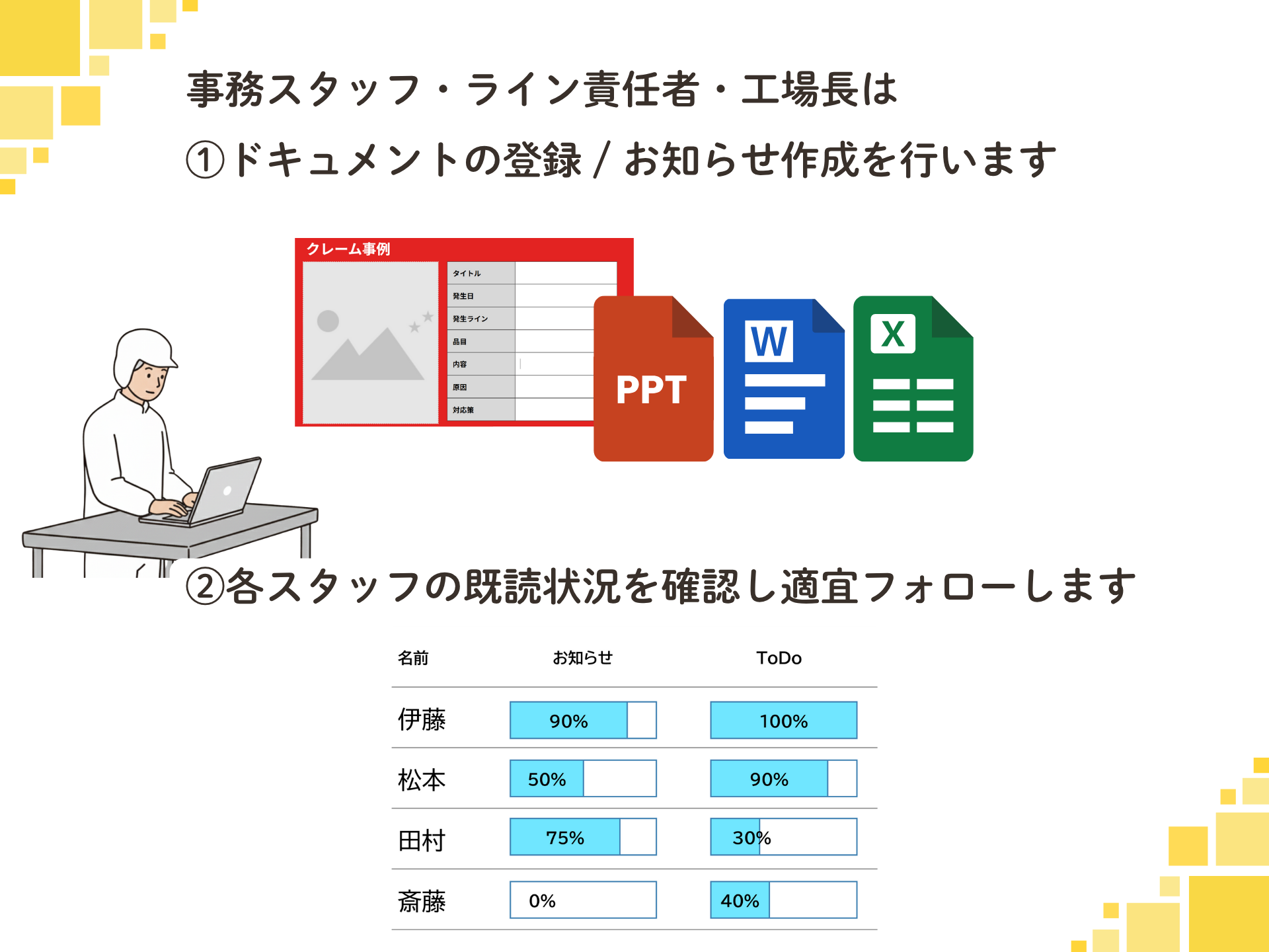 タブレット1台で、工場内の全スタッフにお知らせ・作業指示・教育情報を簡単に共有できます。