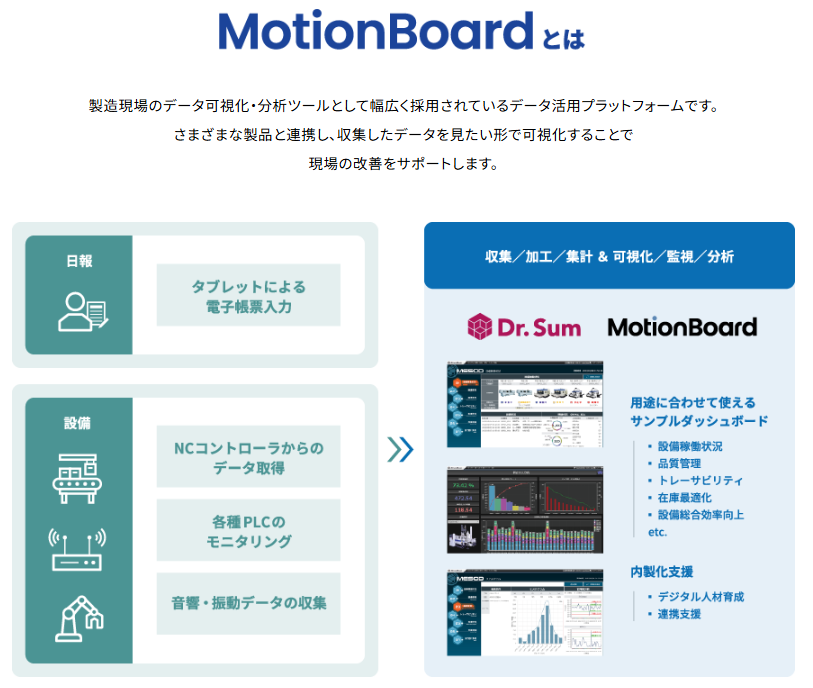 MotionBoardは製造プロセスにおけるあらゆるデータを統合・集計して可視化するダッシュボードです。