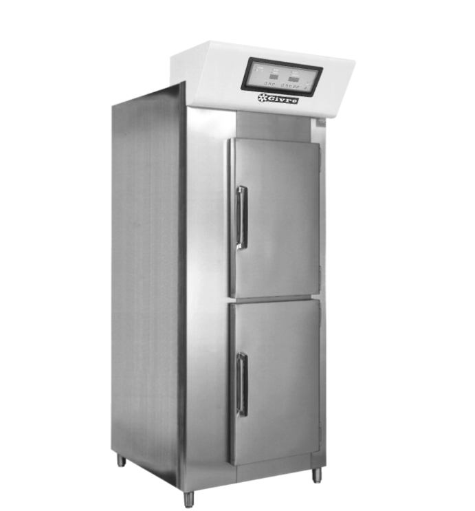Givre(ジーブル)は、強冷・弱冷・解凍の3モードをフルオートで切り替え可能なフリーザーです。簡易ブラスト冷却からパーシャル管理、解凍までを1台で対応し、工程の効率化と省人化を実現します。曜日・時間ごとの自動運転設定により、誰でも安定した温度管理が可能です。