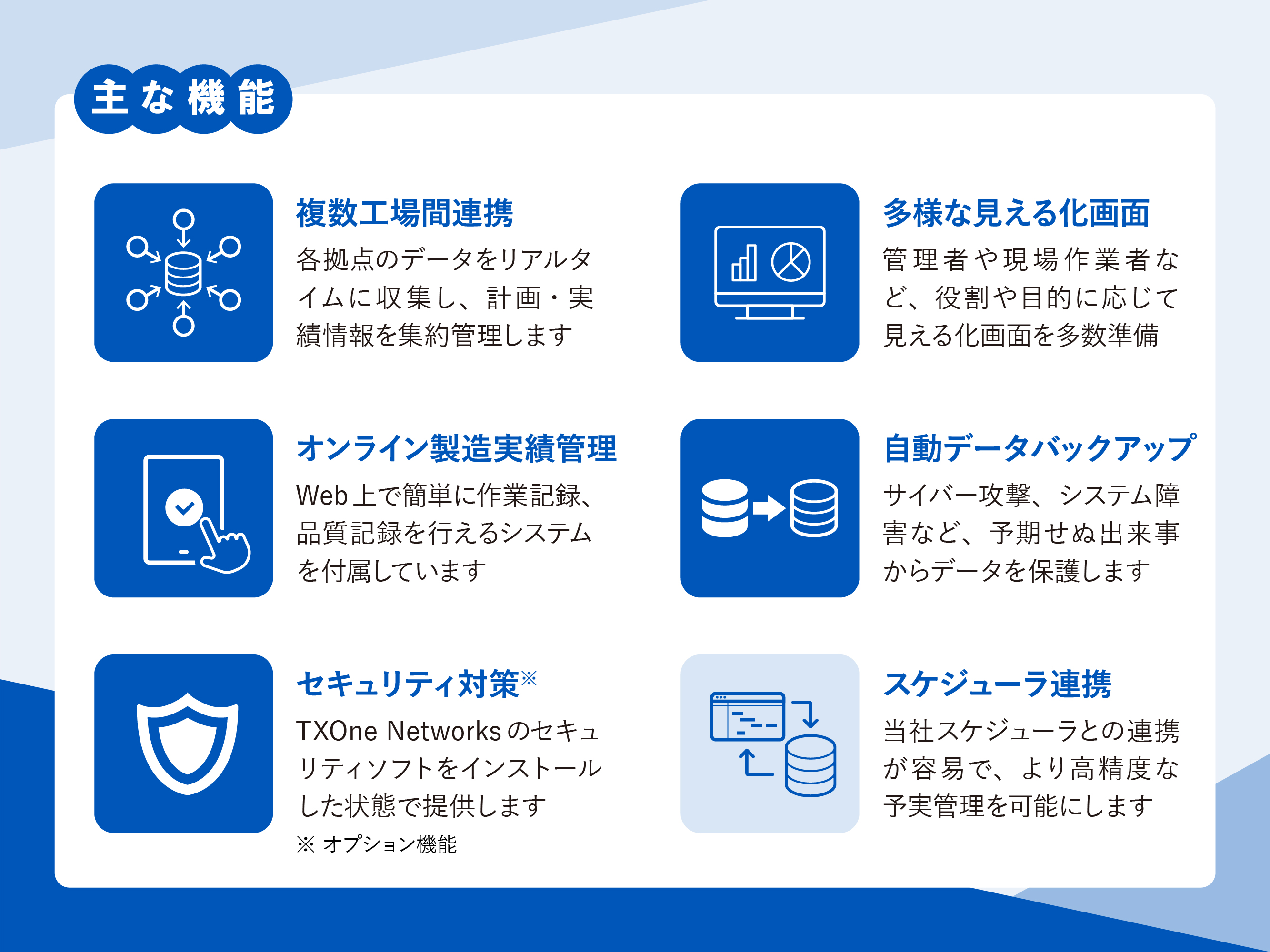 生産ラインのさまざまな設備やシステム、機能とリンクし、稼働状態や労働者の作業を監視・管理するシステムです。デジタルかつリアルタイムな情報連携で、複数工場や関連工場の状態を見える化し、製造サプライチェーンの強化を支援する製造実行管理システムです。