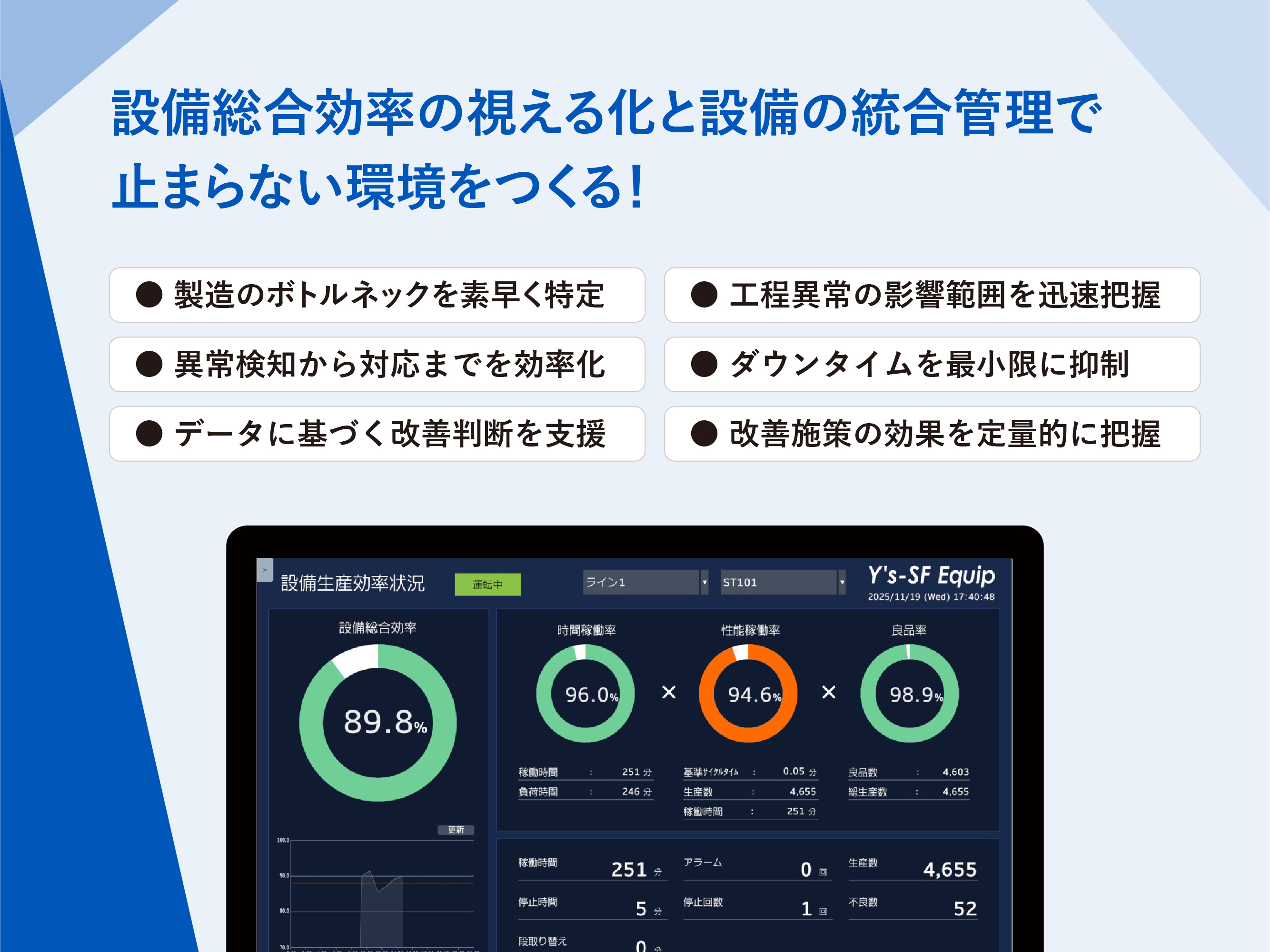 Y's-SF Equipはデータの可視化を通じて生産課題を発見し、製造DXを簡単に体感できるシステムになっています。