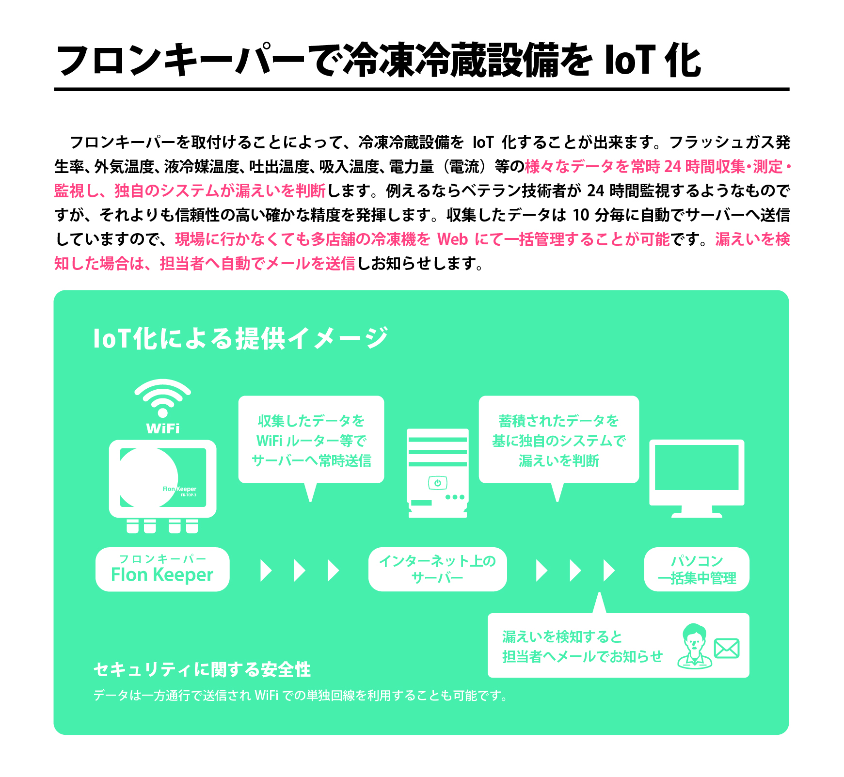 ■フロンキーパーを取り付けることで、お使いの冷凍設備をIoT化し、外気温度、液冷媒温度、吐出温度、吸入温度、電力量(電流)等の様々なデータを常時24時間収集・測定・監視し、独自のシステムが漏えいを判断します。現場に行かなくても多店舗の冷凍機をWebにて一括管理することができ、漏えいを検知した場合は、担当者へ自動でメールにて通知を送信します。(画像「WEB管理画面」「フロンキーパーで冷凍冷蔵設備をIoT化」参照)