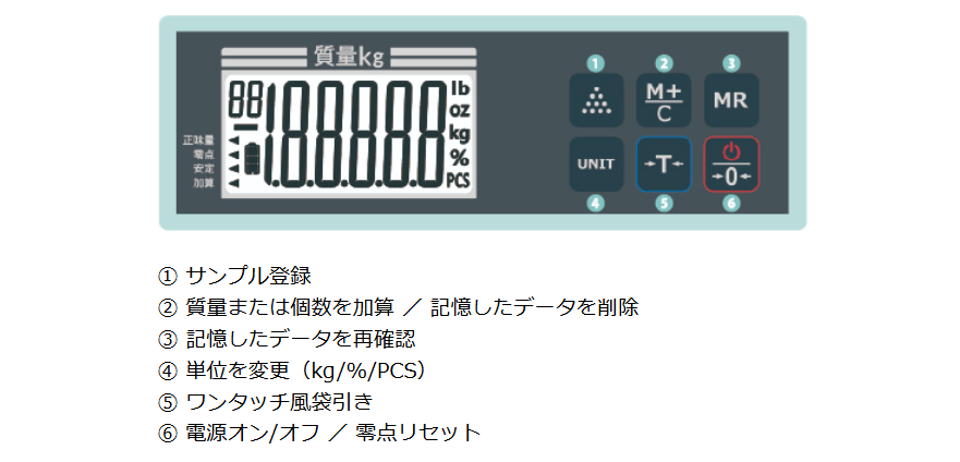 機能:零点リセット、風袋引き(ワンタッチ風袋引き)、バックライト機能