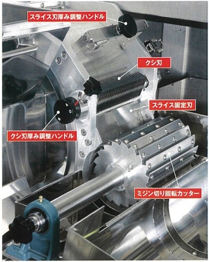 切断方法(寸法):ミジン切り4~10㎜、スライス0.8~12㎜、千切り4・8㎜切替