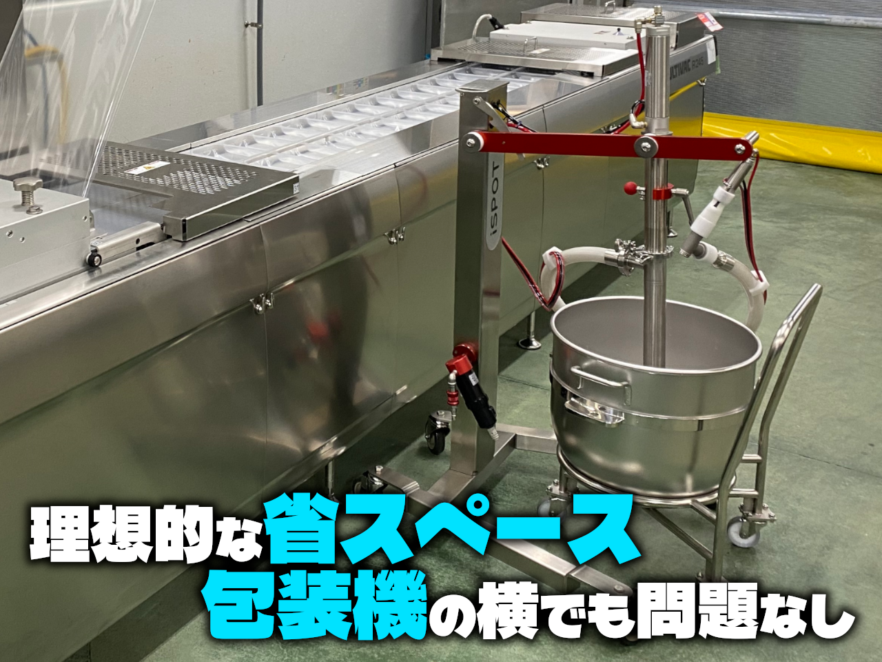 iSpot(アイスポット)充填機は今迄に無いアイデアで液体から粘性のある製品(固形物を含みません)をボウルやバケツから直接吸い上げ充填が行えます。各種調味液&タレ類、各種ソース、サラダドレッシングケーキ生地や乳製品等の比較的粘性のある製品充填に適したユニークで便利な充填機です。製品アイテム数の多い現場でも活躍します。