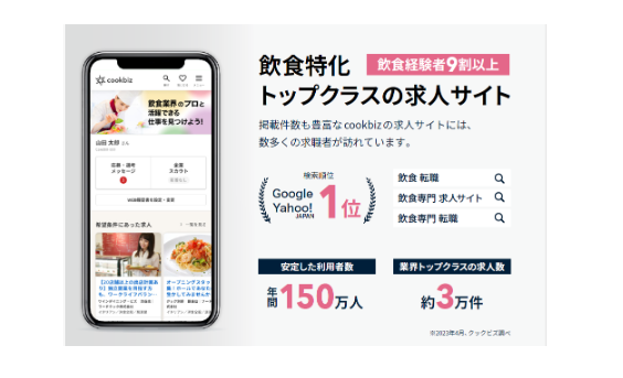 クックビズ求人広告サービスは、飲食業界に特化した求人掲載サービスです。 飲食経験者を中心とした求職者に向けて、正社員・契約社員・業務委託の求人情報を掲載できます。 求人ページには、PRキャッチ、メッセージ、仕事内容、募集要項、画像などを掲載でき、企業や店舗の魅力を詳しく伝えることが可能です。 地域・職種・業態・雇用形態・勤務地などの検索軸に加え、飲食特化ならではの特徴検索にも対応しており、求職者とのマッチング機会を広げます。 また、WEB広告、求職者向けメール配信、Googleしごと検索対応などのプロモーションも展開され、求人への流入促進を支援します。 求人広告の掲載だけでなく、ダイレクトオファー、研修・セミナー、コンサルティングサービスなど、採用から育成まで幅広い支援にも対応しています。 【主な仕様・掲載内容】 ・対応雇用形態:正社員、契約社員、業務委託 ・掲載プラン:C1〜C5 ・掲載期間:4週間または8週間 ・対応エリア:1都道府県または複数都道府県 ・求人掲載数:1求人〜10求人 ・求人ページ掲載内容:PRキャッチ、メッセージ、仕事内容、募集要項、画像など ・画像掲載:最大5点 ・業態選択:3つまで ・検索軸:地域、職種、業態、雇用形態、勤務地、特徴検索など ・掲載開始まで:最短5営業日 ・オプション:カメラ撮影、ダイレクトオファー、研修・セミナー、コンサルティングサービス