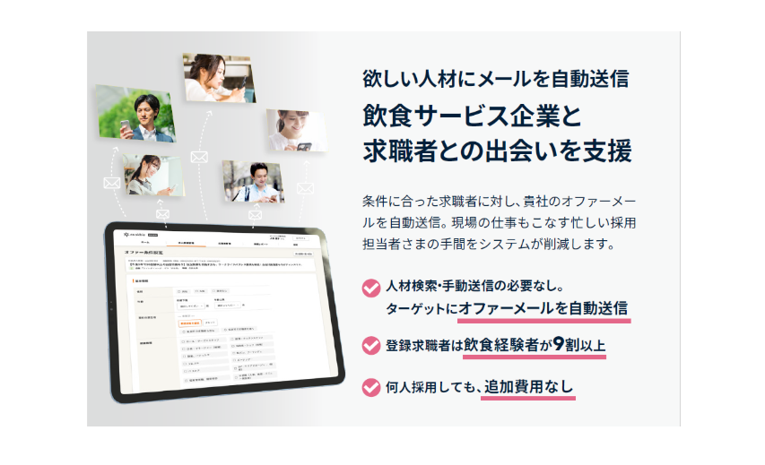 クックビズ ダイレクトオファーは、条件に合った求職者へオファーメールを自動送信できる採用支援サービスです。 飲食業界経験者を中心とした求職者に対して、採用担当者の手間を抑えながら効率的にアプローチできます。 最初に求める人材条件を設定するだけで、システムが対象となる求職者へ自動でメールを送信します。 人材検索や手動送信の必要がなく、日々の業務で忙しい採用担当者でも利用しやすい点が特徴です。 管理画面では、オファー設定、送信、応募、入社までの進捗管理が可能です。 また、求職者とのメッセージのやり取り、求人原稿管理、選考管理、掲載レポートの確認にも対応しています。 【主な仕様・機能】 ・サービス内容:ダイレクトオファー/スカウトメール自動送信 ・対象求職者:飲食経験者を中心とした登録求職者 ・登録求職者数:110,000人以上 ・飲食経験者:9割以上 ・主な機能:オファーメール自動送信、求人原稿管理、メッセージ管理、選考管理、掲載レポート ・送信方法:条件設定後、システムが対象求職者へ自動送信 ・リマインド:反応がない求職者へ再アプローチ可能 ・管理項目:オファー応募数、送信通数など ・利用期間:4週間、8週間、12週間 ・最大求人数:1求人〜10求人 ・料金形態:UU数、利用期間、最大求人数に応じた料金設定 ・追加採用費用:何人採用しても追加費用なし