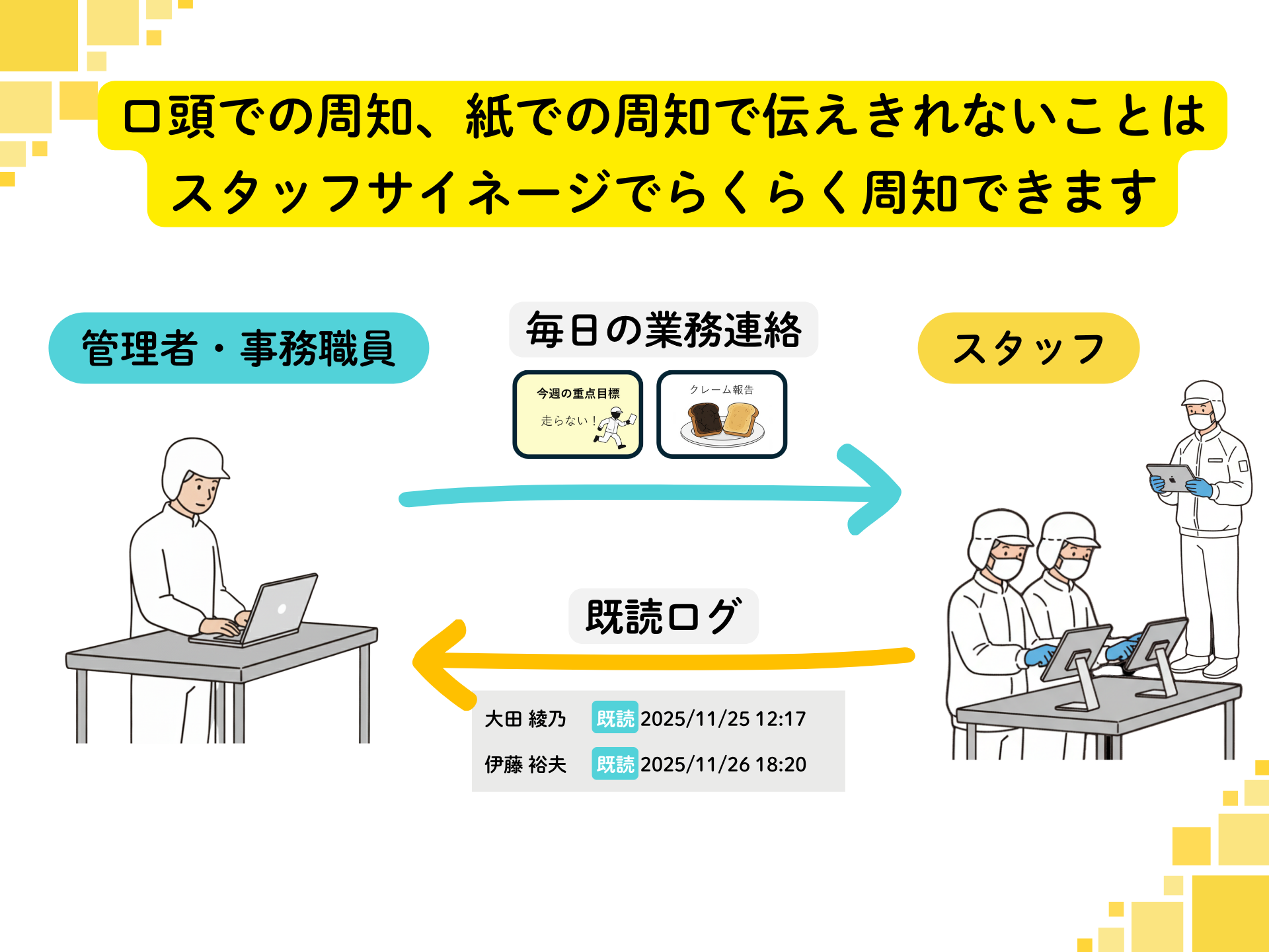 スタッフサイネージ®とは(特許出願中) 現場の“伝わらない”を無くす、現場の情報共有を“見える化”するツールです。 タブレット1台で、工場内の全スタッフにお知らせ・作業指示・教育情報を簡単に共有できます。 PCやスマホを持たないスタッフでも、タッチ操作だけで内容を確認でき、「誰が・いつ・どの情報を見たか」を自動で記録します。 ----------- スタッフサイネージ®で解決できる主な課題 ◆ ① 情報伝達のムラ・抜け漏れ 課題: 口頭や紙での連絡では、シフト勤務や夜勤などで全員に伝わらない 解決: お知らせを一括配信でき、全員の既読状況を一覧で確認。伝達漏れを防止。 ◆ ② 紙掲示・張り替えの手間 課題: 掲示板や回覧での貼り替え作業が多く、更新のたびに時間がかかる 解決: PCから簡単に配信・更新でき、古い情報は自動で非表示。現場の掲示作業をゼロに。 ◆ ③ 周知した証拠が残らない 課題: 「伝えた/聞いてない」の確認や、監査対応が大変 解決: 既読履歴が自動で残り、監査時のエビデンス提出がスムーズ。 ◆ ④ 教育・衛生指導の定着不足 課題: 教育資料を配っても、全員が読んだか分からない 解決: 動画やクイズ形式で確認でき、理解度チェックも可能。 ◆ ⑤ 外国人スタッフへの周知 課題: 言語の壁で指示内容が正確に伝わらない 解決: 自動翻訳機能により、日本語以外の言語でも同じ内容を確認可能。 ----------- 活用シーン 衛生ルール・5S活動の周知 生産目標・実績の共有 作業手順・注意事項の掲示 年末調整・健康診断などの事務連絡 新人教育・安全訓練動画の配信 ----------- セキュリティと信頼性 スタッフサイネージ®は、AWSクラウド上で安全に運用されており、 情報セキュリティマネジメントシステム(ISMS)クラウドセキュリティ認証 JIS Q 27017:2016(ISO/IEC 27017:2015)を取得しています。 食品工場や医療現場など、高いセキュリティ基準を求められる現場でも安心して利用できます。