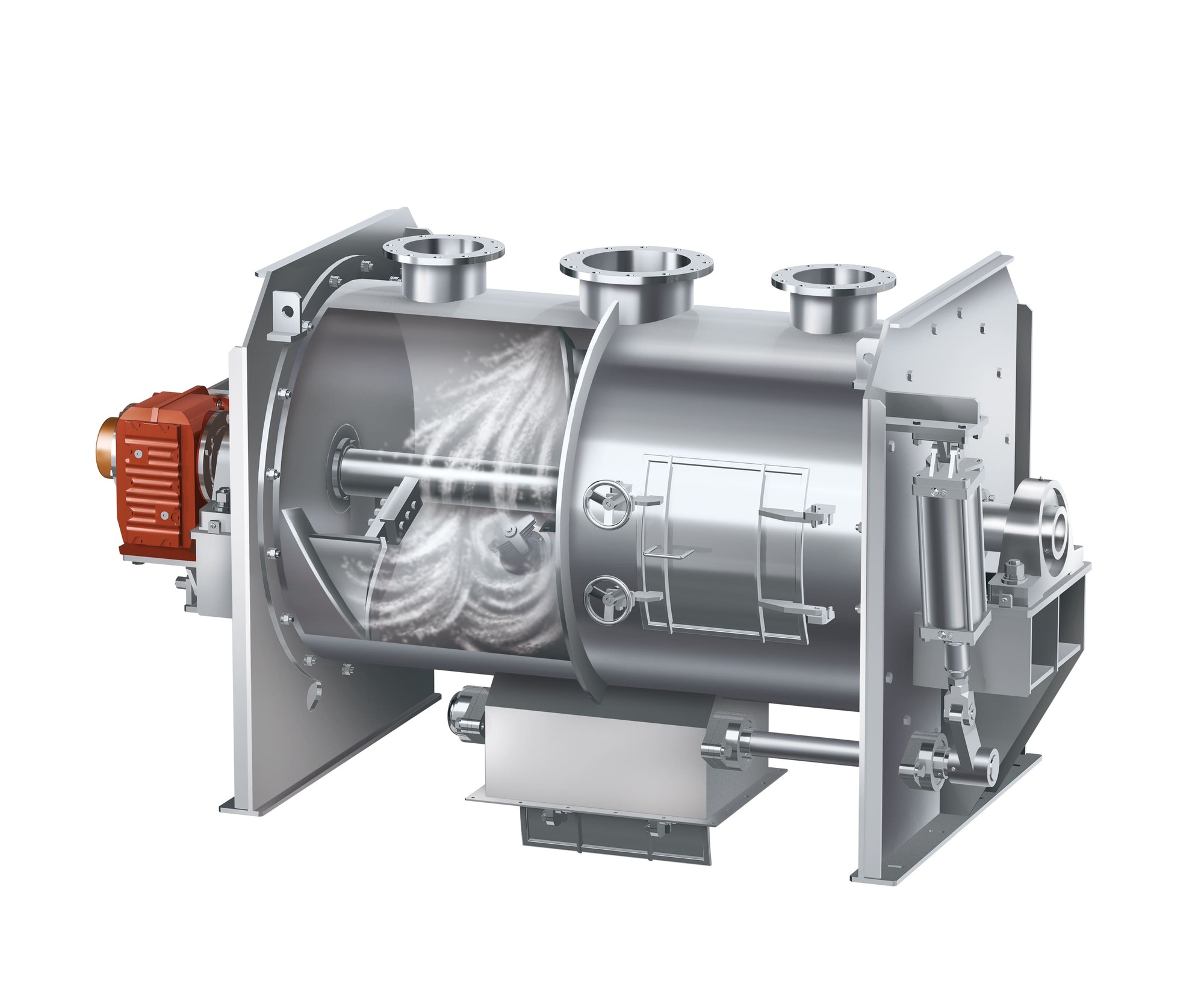 パムアペックスミキサは独自形状のスキ型ショベル羽根による浮遊拡散混合と、多段式チョッパによる高速剪断分散の2つの機能を兼ね備えた混合機です。 従来では困難とされていた「強力分散混合」を可能とし、また各々の作用を効率よく分担している為、機器のトータル動力の「省エネルギー」も特長としており、粉体材料の新しい用途の可能性を広げる混合機として500台以上の納入実績がございます。 さらにミキサのドラム外周部を加熱ジャケット方式とし、更にドラム内を減圧状態にすることにより、粉体乾燥表面積の大きい、効率の良い乾燥条件が得られ、1台で粉体混合・液添加・乾燥・冷却が可能です。 また過熱蒸気をミキサ内部に供給することにより、伝熱性が高く、除菌・脱油・酸化防止等の効果も期待できる乾燥も可能です。 食品業界はもちろん、化粧品、一般化学、肥料、建材、電子材料と様々な業界で使用されています。