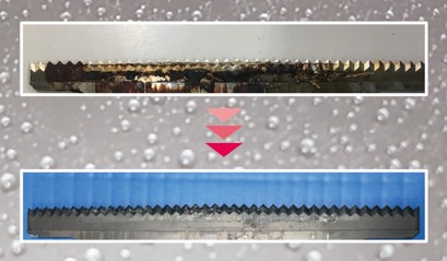 非粘着PFASフリー複合コーティング「モーグルNeo」 食品加工業界、包装機器業界等で使用されるギザ刃や治具等にコーティングを施すことで、粘着物が付着しにくくなり、また付着しても除去が簡単に! 耐摩耗性に優れ、ギザ刃の長寿命化を実現。 PFASフリーで環境にも配慮。 ポジティブリスト適合宣言書発行可能。