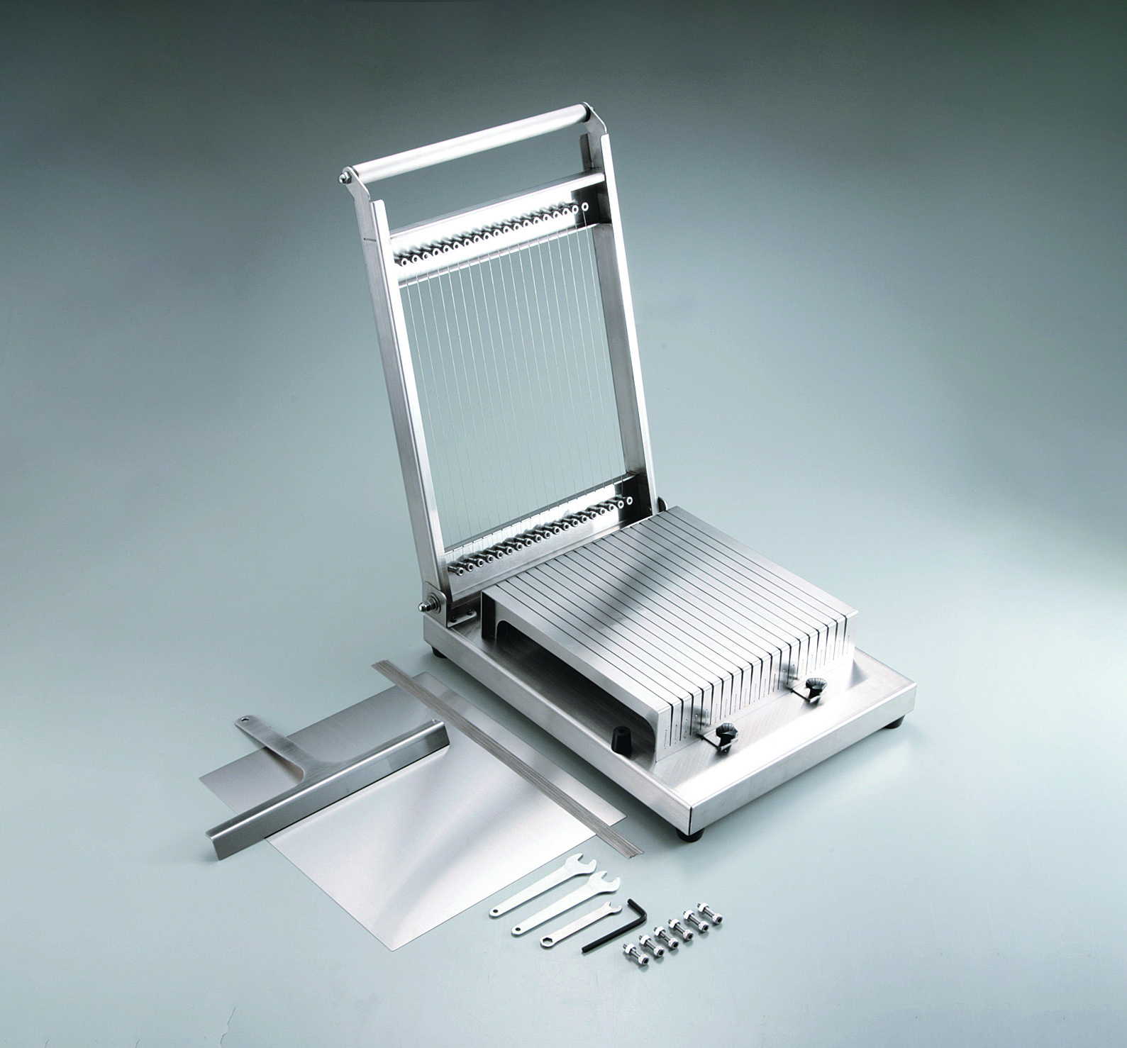 一定の幅にセットされたステンレスワイヤーできれいにカット出来ます。 ワイヤーカット部と台が取り外せて洗浄しやすく、ステンレスで衛生的です。 生チョコレート、チーズ、バター、羊かんなどに。 カット幅は、20mm用 25mm用があります。 付属品:Tバー1本、レンチ1本、スパナ大2本、 スパナ小1本、ボトルナット6組、 下敷き(ステンレス)1枚、替えワイヤー40本 *カット幅とカット台はセット(専用)になります。