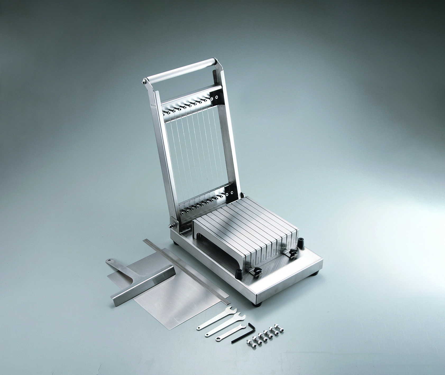 一定の幅にセットされたステンレスワイヤーできれいにカット出来ます。 ワイヤーカット部と台が取り外せて洗浄しやすく、ステンレスで衛生的です。 生チョコレート、チーズ、バター、羊かんなどに。 カット幅は、15mm用 20mm用 25mm用 30mm用があります。 付属品:Tバー1本、レンチ1本、スパナ大2本、 スパナ小1本、ボトルナット6組、 下敷き(ステンレス)1枚、替えワイヤー40本 *カット幅とカット台はセット(専用)になります。