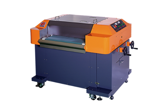 板金の平面専用バリ取り機 バフが高回転し、材料の表面を研削 粉塵、発熱のない湿式加工式 後側のバフは逆転可能(ワークの入口側と出口側のバリ取り能力を調整) タンク内蔵式のコンパクトタイプ キャスター付きで、簡単な移動が可能 板厚調整はデジタル式 着脱が簡単な半割バフを採用 ワンタッチ開閉式トップカバーでメンテナンスも容易