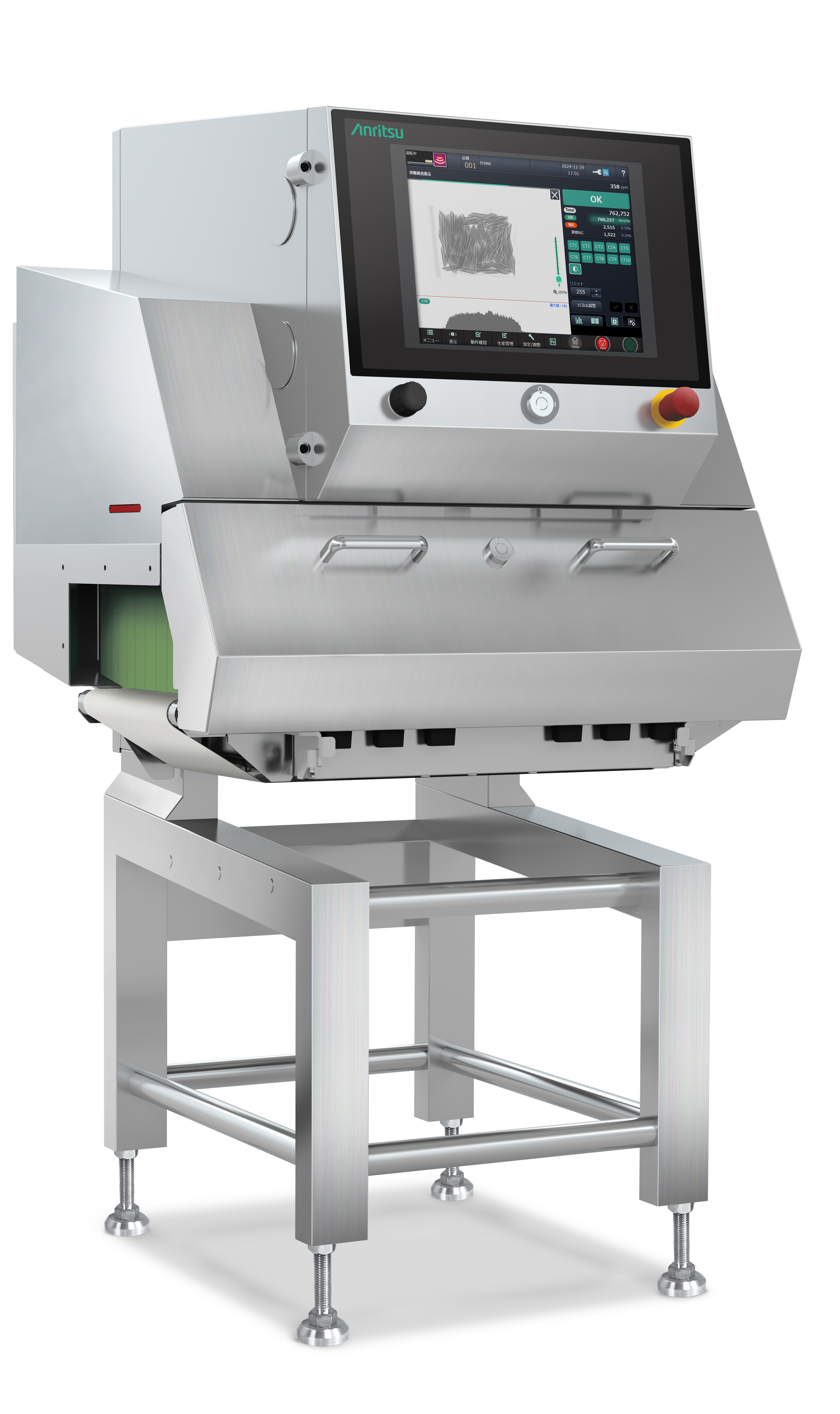 XR76シリーズは、誤検出の大幅な低減、スマートフォンのような直感操作性、簡単登録モードなど、省力化を徹底的に追及することにより、食品業界が抱える課題解決に貢献します。 ■誤検出低減による歩留まり向上 検出性能の向上により、要求される感度に対して余裕を持った検出リミット値を設定することが可能になりました。誤検出を大幅に低減し、歩留まりを向上します。 ■従来比で最大3ランクの検出感度向上 新開発の高性能X線センサを採用し、X線画像の解像度を大幅に向上しました。微細な構造や形状まで鮮明に捉えられるようになり、従来検出が難しかった微細な金属異物や密度が低い異物も、高精度に検出できるようになりました。テストピース換算で最大3ランクの感度向上を実現し、製品の品質向上に貢献します。 ■高速ラインでの性能向上 高速生産ラインにおいて、従来機では高速搬送される製品のX線画像が歪み、異物の検出感度が低下するという問題がありました。新型センサのスキャン速度向上により、ベルト速度80m/minでもクリアな画像を取得し、従来比で検出感度を大幅に向上させました。高精度な検査を安定して行うことが可能です。 ■簡単登録モードで手動調整が不要 品種登録は通常登録と簡単登録モードの2種類から選択できます。簡単登録モードでは、品種名など基本的な情報を入力後、検査品を一回流すだけで設定が完了します。さらに、誤検出を防ぐため余裕を持たせたリミット値が自動設定されます。これにより、従来機と同等レベルの検出感度を維持しながら、自動設定終了後の手動調整作業が不要になります。 ※お客様の管理感度を満たしていることの確認は必要となります。 ■スマートフォンのような直感操作性 画面デザインとユーザーインターフェースを刷新し、スマートフォンのような操作が可能になりました。X線画像のピンチイン/アウトによる縮小/拡大や、異物部分をダブルタップで拡大表示、リストをスワイプでスクロールするなど、直感的に操作できます。