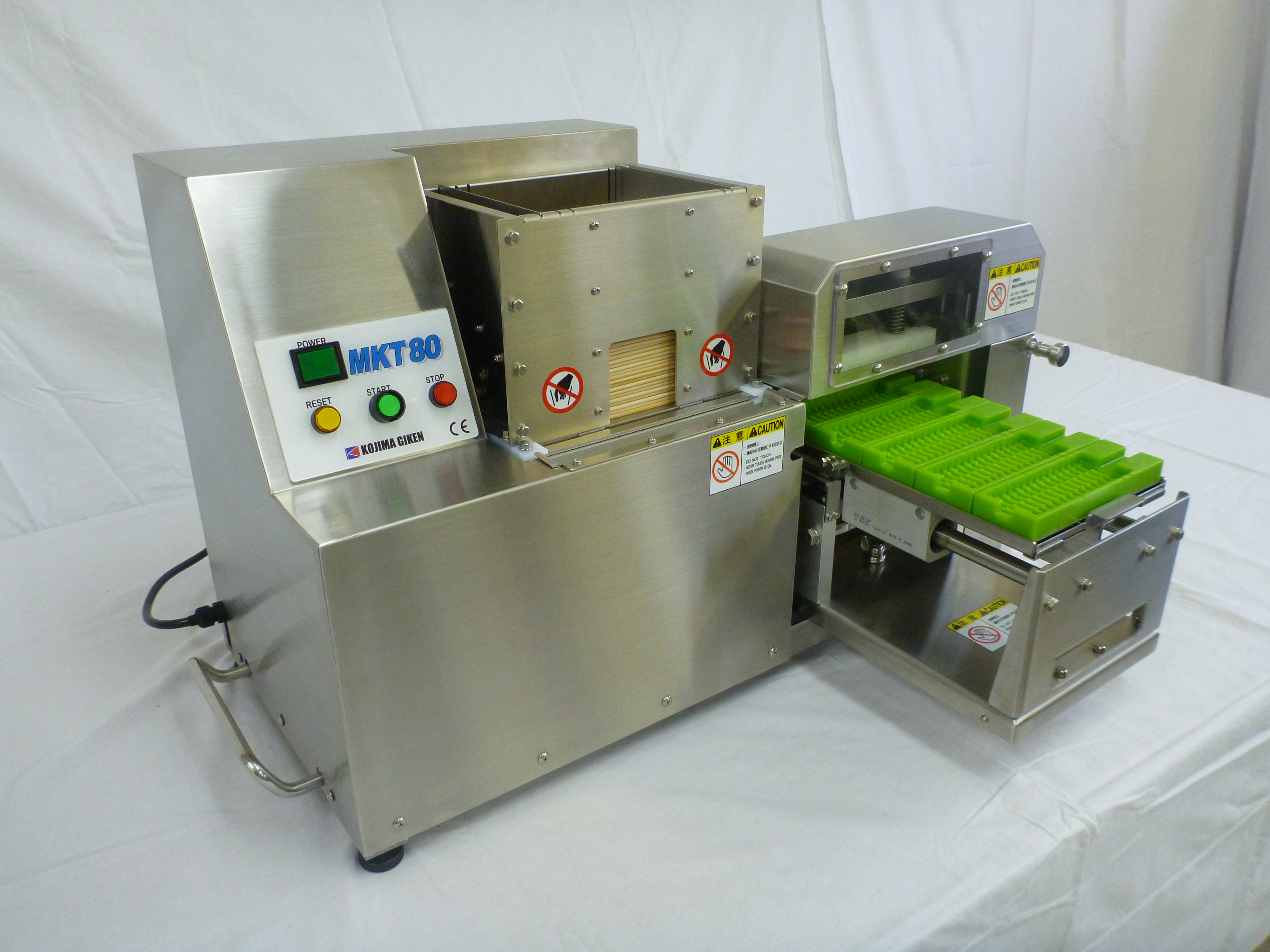 新設計のパレット方式ちびスケ ちびすけJr. MA102TSよりも多くの串刺しを行いたいけど、コンベア型の大型機までは必要ないというお客様の要望に応えました。新設計のパレット方式を採用したMKT80は一度に5本づつの串刺しを行います。短時間で仕込みを終えたい繁盛店やセントラルキッチンを持ったチェーン店、スーパーの厨房などに最適です。長さ180㎜までの丸串が使えます。海外仕様やCE認証仕様もございます。