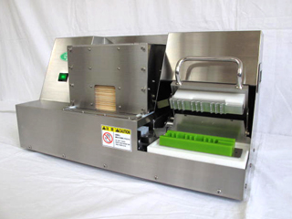 〈最大生産量4,000本/時間〉 ■鉄砲串が使える高速機 鉄砲串等の多種類の串の大量生産を可能にしたモデル。駆動には新設計の空圧高速駆動を採用しています。間欠式コンベアには新たにステッピングモーターを使いコンベアの動きがスムーズになりました。使い手の疲労度が低減した新型MWAシリーズです。長さ180㎜までの串に対応。 【特徴】 誰でも使いやすい簡単操作 新設計の間欠式コンベア(新たにステッピングモーターを採用)で作業の疲労度を低減 (MWA8, MWA8T, MWA10) 空気の圧力を利用した新設計の高速空圧駆動方式を採用し大量生産を可能にしました 長さ200mmまでの丸串に対応(MWA8Tを除く) 長さ180mmまでの鉄砲串、角串、平串、丸串を使えます(MWA8Tのみ) 脱着式食材トレー(実用新案)は脱着洗浄が可能で衛生的です コンベアの長さを二種類選べます 非常停止ボタン標準装備 ※最大生産量はあくまで目安です。実際の生産量は対象となる食材や作業員によって異なります。 ※MWAシリーズは空気圧を利用して駆動しています。機械本体には一次エアーは装備していませんのでユーザー側でご用意頂く必要が有ります。本機導入の際にはご注意ください。 【オプション】 追加非常停止ボタン