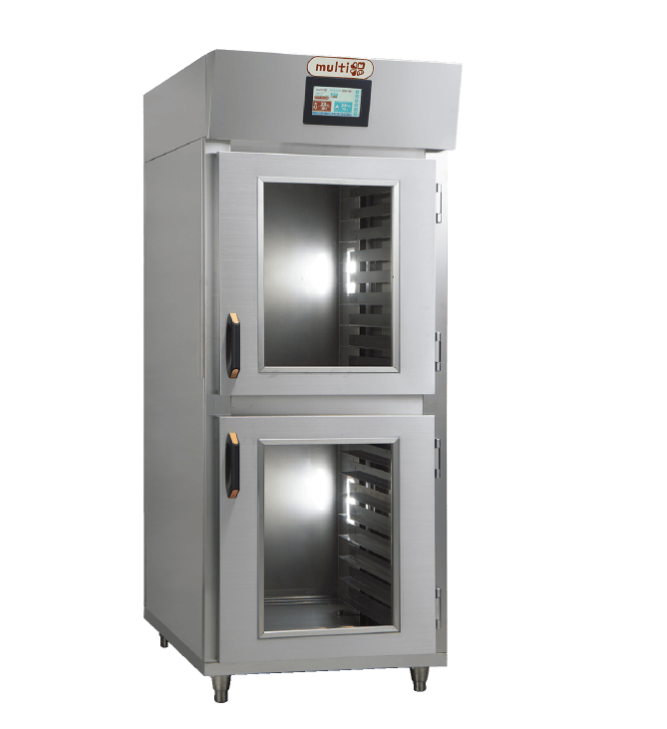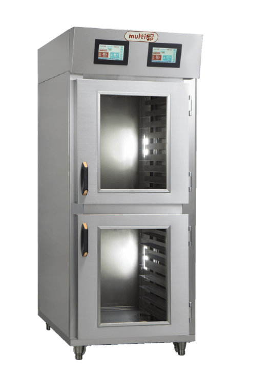 Multi-Tは、2室完全独立制御を採用したツインタイプのドゥコンディショナーです。冷凍機を2台搭載し、各室ごとに異なる条件での運転が可能です。冷蔵から自然解凍、低温発酵、ホイロまでを段階的に制御することで、生地にやさしく高品質な発酵を実現します。さらに、曜日ごとの工程設定や運転パターンの記録機能により、多品種・計画生産にも柔軟に対応できる製品です。