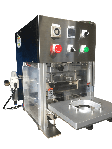 卓上型/戦力になります。 電源 100V エアー源 必要です。 能力 500個/時間 卓上型 自動機です。 エアー加圧式で安定したシール&トリミング。 印刷フィルムが使用可能
