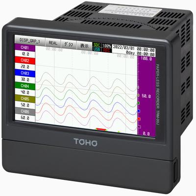 大型液晶タッチパネルによる簡単操作のペーパレスレコーダ <仕様> ・入力点数:6点 熱電対13種類、測温抵抗体2種類、直流電圧/電流入力(要シャント抵抗)8種類を最大6点まで記録 ・表示部:7インチワイドTFTカラーLCD(800×480ドット) ・外部記録媒体:SDカード、USBメモリ対応 ・内部メモリ:4GB ・通信機能:RS485 Modbus/USB2.0 Modbus(標準装備) ・サイズ:185(W)×160(H×188(D)mm ・重量:1.4kg